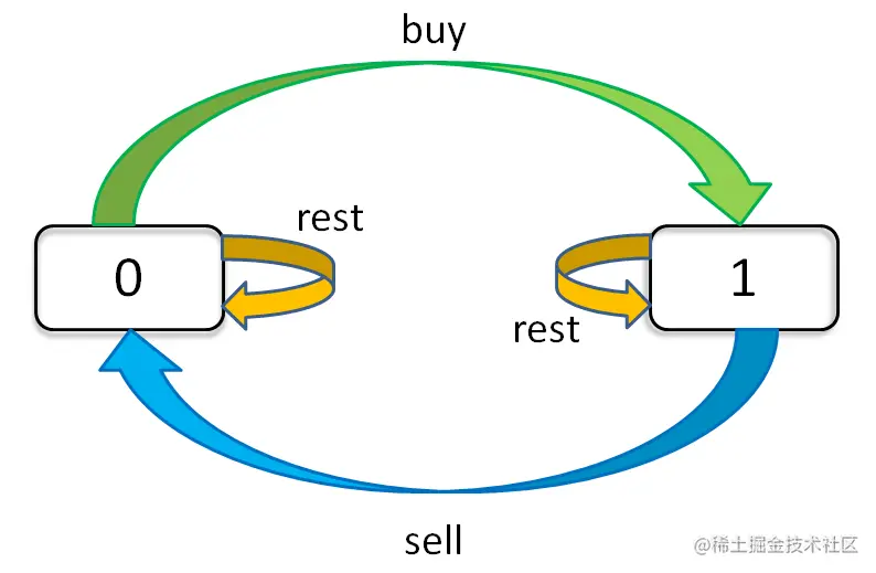 现在,我们完成了「状态」的穷举,我们开始思考每种「状态」有哪些「选择」,应该如何更新「状态」。只看「持有状态」,可以画个状态转移图。