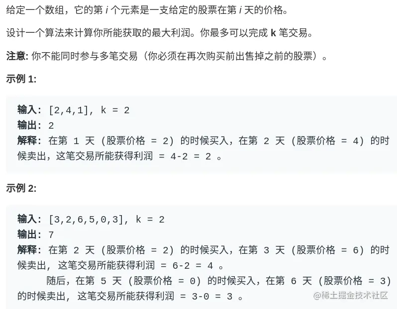 这个解释应该很清楚了,如果 buy,就要从利润中减去 prices[i],如果 sell,就要给利润增加 prices[i]。今天的最大利润就是这两种可能选择中较大的那个。而且注意 k 的限制,我们在选择 buy 的时候,把 k 减小了 1,很好理解吧,当然你也可以在 sell 的时候减 1,一样的。