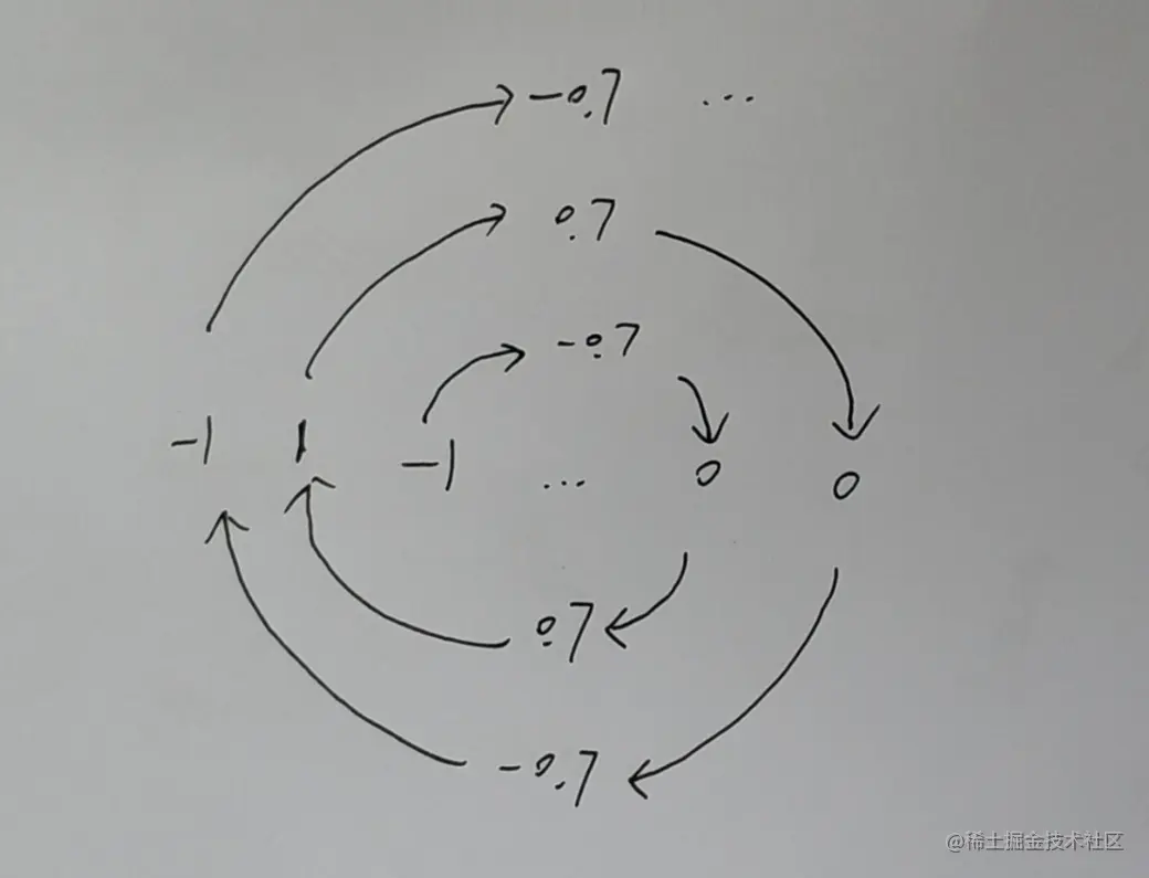 如上图所示,如果物体当前位置等于初始位置,那么当前位置和初始位置的点积就是1;