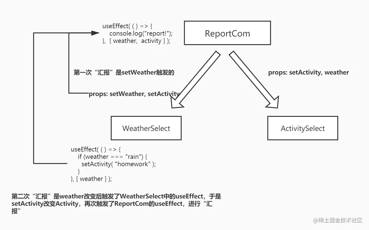 进一步究其原因:activity与weather在同一个useEffect的dependencies中,activity又通过useEffect逻辑依赖于weather,setActivity异步生效导致最终了两次”汇报“。