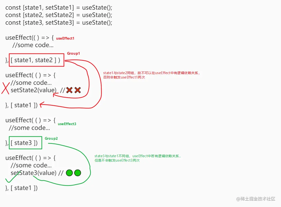 那么根据这个原因进行抽象,则可以把同一个useEffect的dependencies归纳为一组,同组的值则需要谨慎在其他useEffect callback中有逻辑依赖关系。