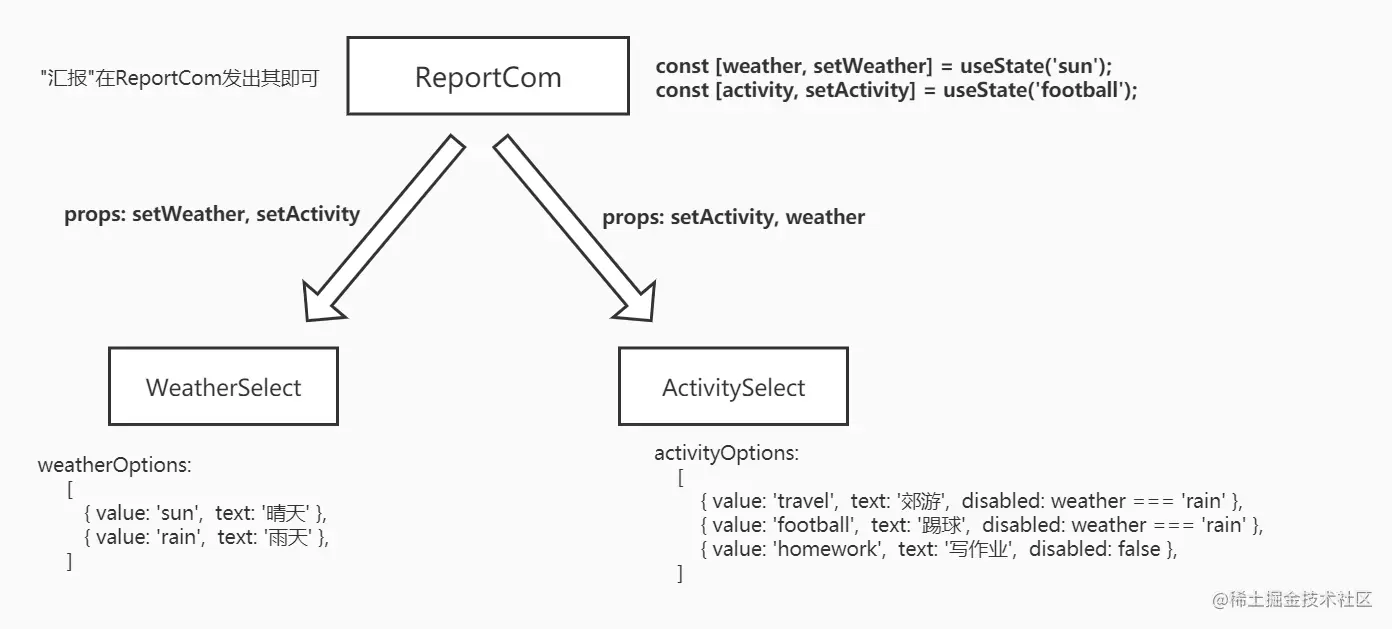 设计我们的组件实现,为了使ReportCom尽可能简洁,我们把天气与活动下拉框作为单独的组件,ReportCom仅保持需要的state。
