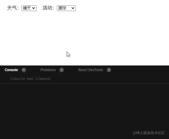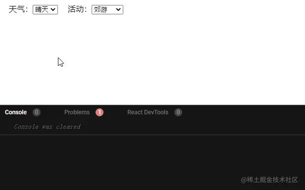 乍一看似乎很美好,主要逻辑放在了ReportCom,其他属性也尽可能地放在了子组件,WeatherSelect似乎利用useEffect掌控了weather对activity的影响,似乎呼啸而出。但是WeatherSelect中的useEffect正是bug的藏身之处!。