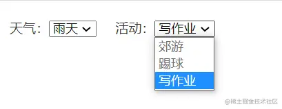 如此有两个下拉框,当其中有任何一个变动时都会进行汇报(真实场景中即发出请求)。如果天气原本是”晴天“,变更为”雨天“的话,活动选项值也应该变为”写作业“。