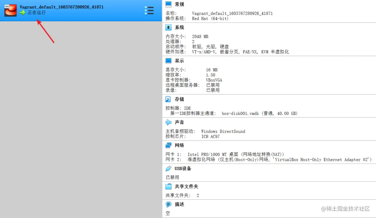 在 Windows PowerShell 中运行 vagrant up,等待片刻,就可以在 VirtualBox 中看到虚拟机已经启动起来了。