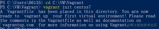 切换到需要安装虚拟机的路径,然后运行 vagrant init <box_name>,执行初始化 Box 操作。