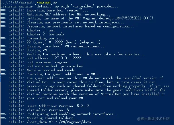配置好后,就会在 vagrant up 命令启动后,看到输出日志: