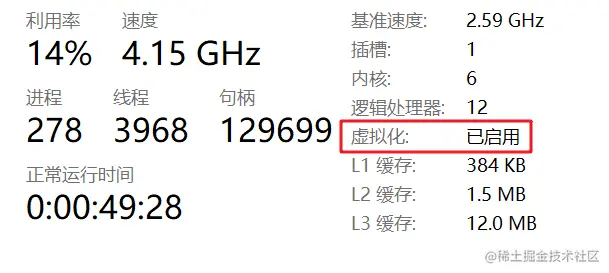 因为会用到底层虚拟化技术,所以我们需要首先在任务管理器的"性能"页签下,确认是否已启用虚拟化技术,如果没有需要在主板 Bios 中开启。