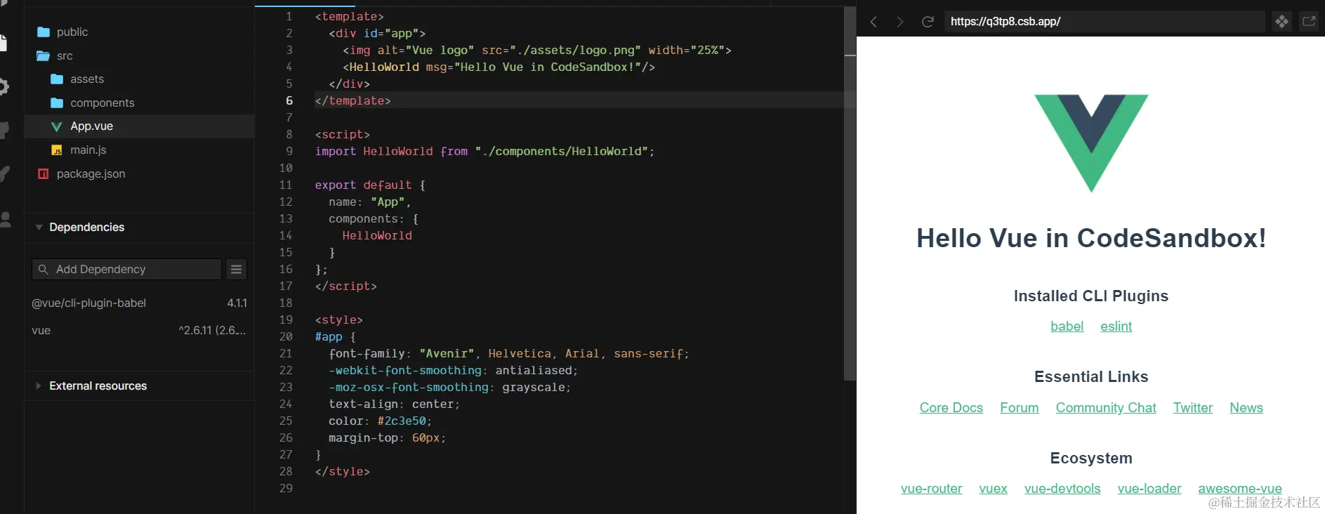 进入codesandbox选择Vue进去之后是这样 ,在APP.vue中可以进行修改