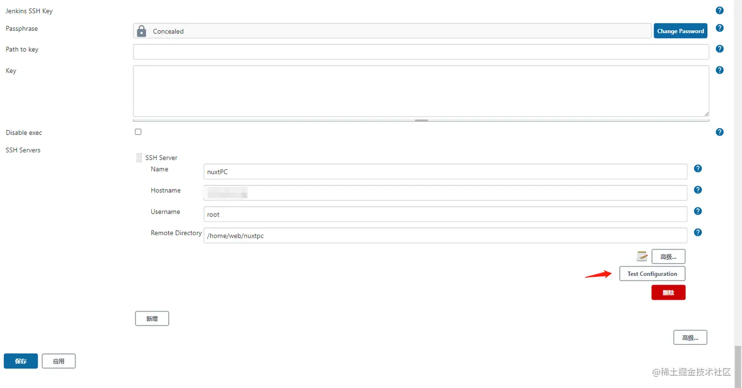 注意:在配置上述内容时,要首先在jenkins服务器上生成私钥,然后将公钥推送到服务器上。