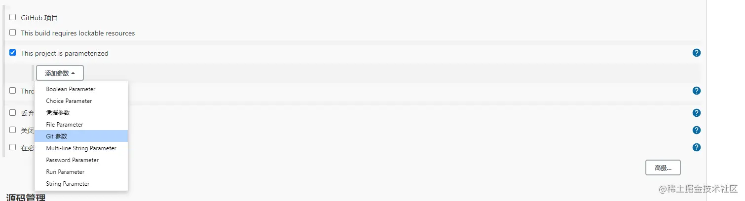 这里是项目的描述等等,我们在这里新增新增一个git分支构建,因为我们的项目在开发过程中肯定有很多分支的,所以这里选择git参数的配置,如果没有这个选择,文章后面会补上相对应的插件