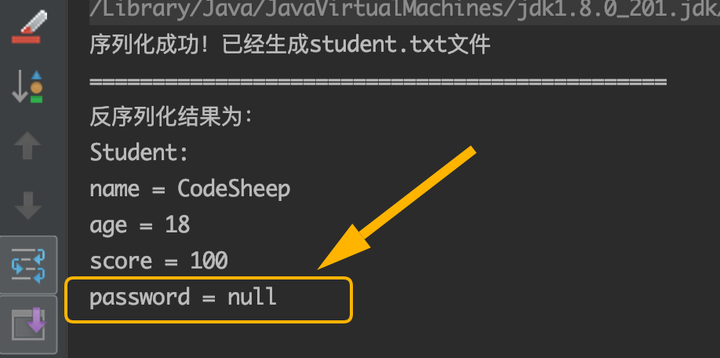 这样在序列化Student类对象时,password字段会设置为默认值null,这一点可以从反序列化所得到的结果来看出: