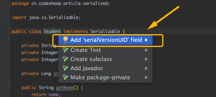 当然,如果不想手动赋值,你也可以借助IDE的自动添加功能,比如我使用的IntelliJ IDEA,按alt + enter就可以为类自动生成和添加serialVersionUID字段,十分方便:
