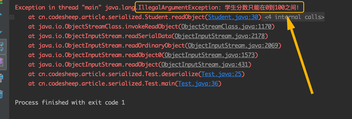 比如我故意将学生的分数改为101,此时反序列化立马终止并且报错: