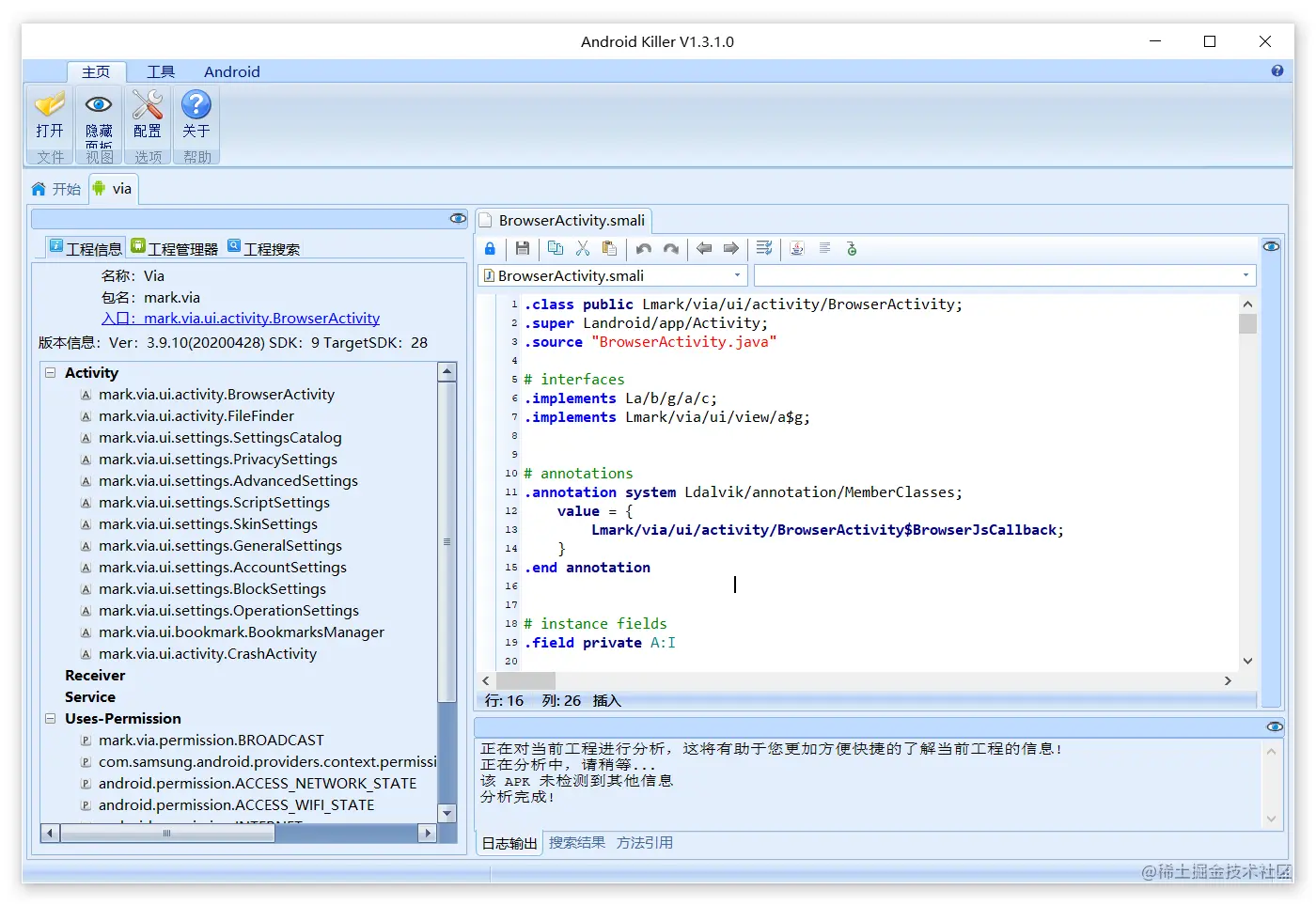 左侧有apk的入口页面、以及版本信息、四大组件列表、权限信息等