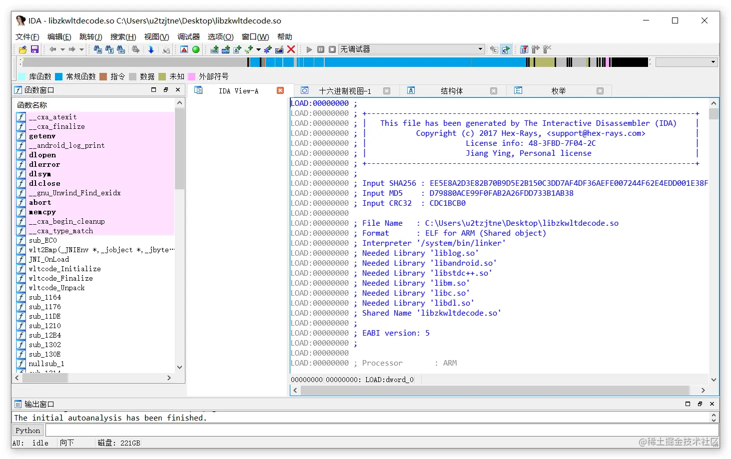 功能:IDA Pro能够对so文件进行反汇编,从而将二进制代码转化为汇编语言,利用IDA Pro神奇的F5功能还能将汇编语言反编译成c/c++程序