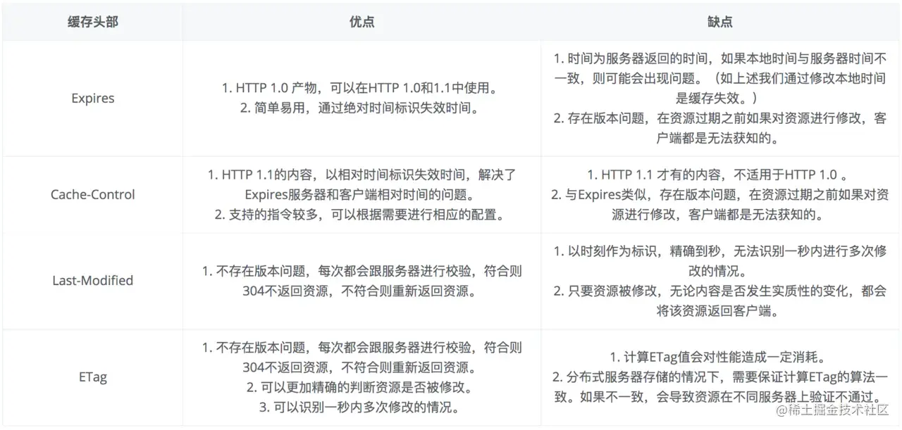 缓存处理,在 HTTP1.0 中主要使用 header 里的 If-Modified-Since, Expires 来做为缓存判断的标准,HTTP1.1 则引入了更多的缓存控制策略例如 Entity tag,If-Unmodified-Since, If-Match, If-None-Match 等更多可供选择的缓存头来控制缓存策略。