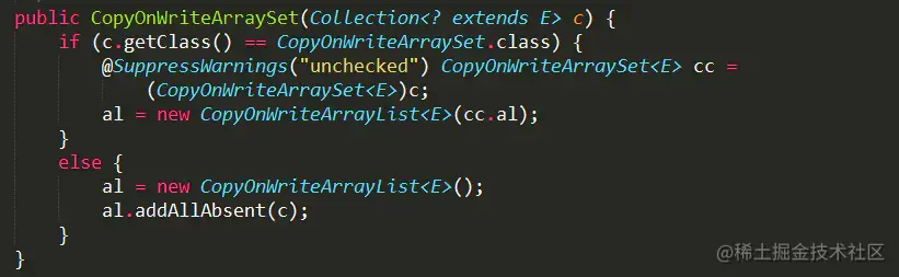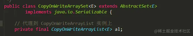 从源码中神奇地发现CopyOnWriteArraySet的底层存储结构竟然是CopyOnWriteArrayList,那么我们就可以知道它的名字的由来了,并且知道它支持并发的原理跟CopyOnWriteArrayList是一样的。
