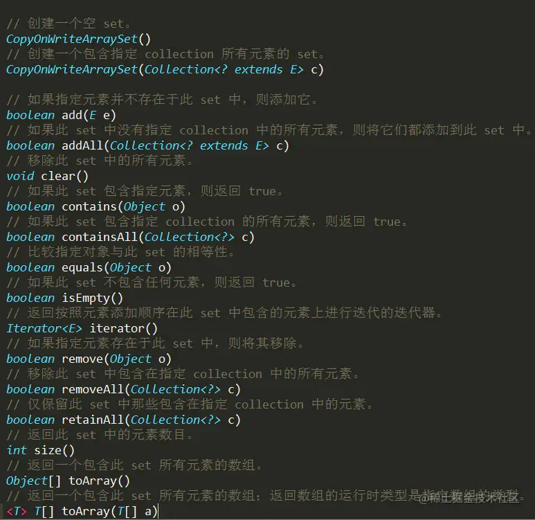 CopyOnWriteArraySet是通过代理CopyOnWriteArrayList的方法来实现的,add操作是通过调用CopyOnWriteArrayList的addIfAbsent方法来实现set集合不重复元素特性的。