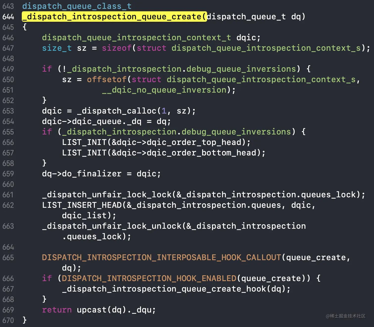 _dispatch_introspection_queue_create方法传入的是dq,先创建dqic(653行创建,654行将dqic的dqic_queue._dq赋值为dq)。659行又将dq的do_finalizer赋值为dqic。之后就返回了upcast(dq)的_dqu。