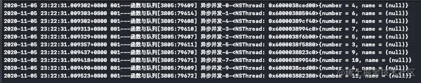 NSLog(@"异步并发-%d-%@",i,[NSThread currentThread]);