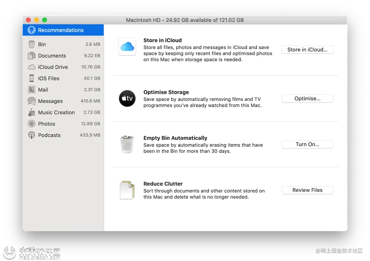 执行此操作后,您将在打开的窗口的左侧看到类别列表。顶部是建议。在此,macOS会建议您删除哪些内容,从而帮助您轻松释放存储空间。例如,它可能建议您将文件存储在iCloud中,并且仅将最新文件保存在Mac上,或者建议您允许操作系统删除已经观看过的Apple TV下载。
