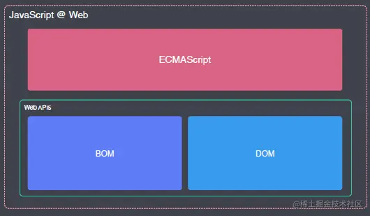 - 在浏览器中,JavaScript = ECMAScript + Web API