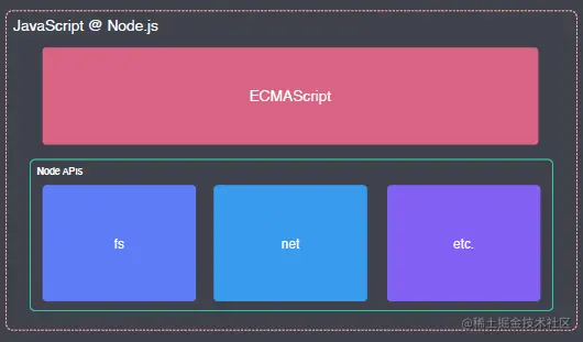 - 在nodejs中,JavaScript = ECMAScript + Nodejs API