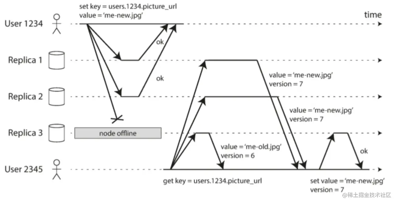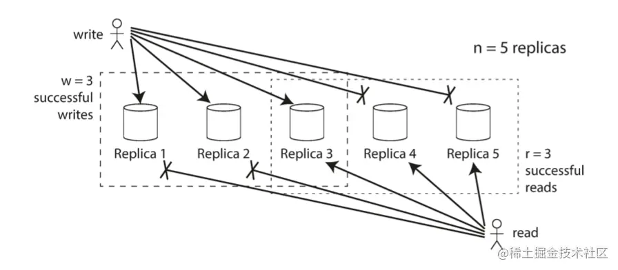 quorum-write or quorum-read: 在一个有 n 个节点的数据库集群中,我们把读写请求同时发往所有节点。我们定义“w”为写操作成功的节点数,“r”为读操作成功的节点数;只要 w + r > n,我们就能确定集群中至少有1个节点是在读操作时返回了最新数据的,因为读操作的节点集合和写操作的节点集合必然有交集。