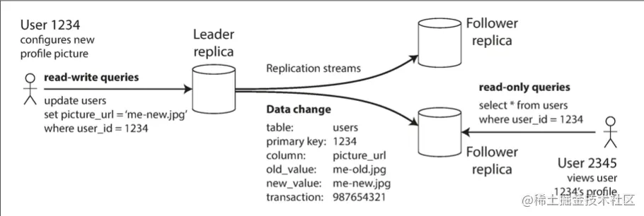 - 其余节点被称为追随者(followers)。每当领导者将新数据写入本地存储时,它也会将数据变更发送给所有的追随者。每个跟随者从领导者拉取日志,并相应更新其本地数据库副本,方法是按照领导者处理的相同顺序应用所有写入。