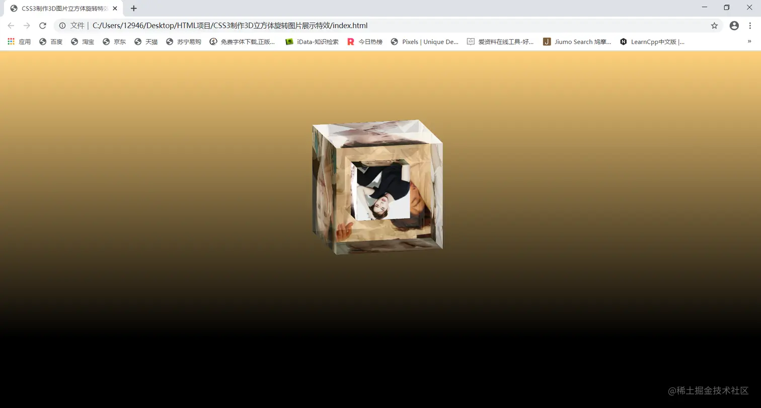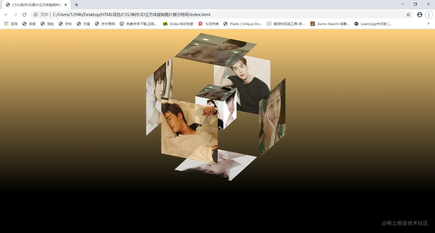 这是用纯css样式做的立体旋转特效,html页面代码和样式代码不算难,根据自己的需要改动方块里的图片即可。背景也是可以随意更改,我这里的背景不太好看,小伙伴们可以根据自己的需要在网络上寻找图片,用ps稍微处理一下就可以得到很好看的样式