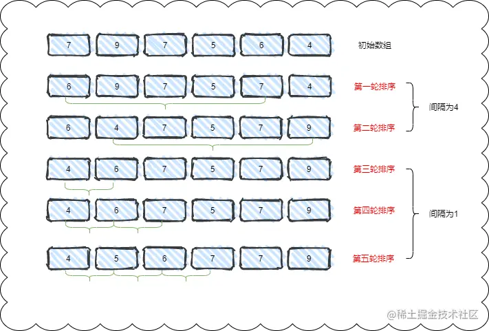 希尔排序是插入排序的一种优化,它并不是比较相邻两个元素,而是比较一定间隔的两个元素,通过缩小间隔来再次重复进行比较。下面是它的执行过程: