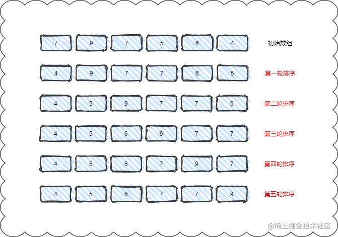 通过上述代码可以很容易看出冒泡排序是一个原地排序算法,接着再去分析冒泡排序是否是稳定的排序算法,还是先来看冒泡排序的执行流程,以上面的例子为准: