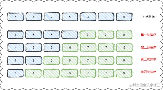 不难看出重复的7一直保持着前后的顺序,所以冒泡排序是一个稳定的排序算法。
