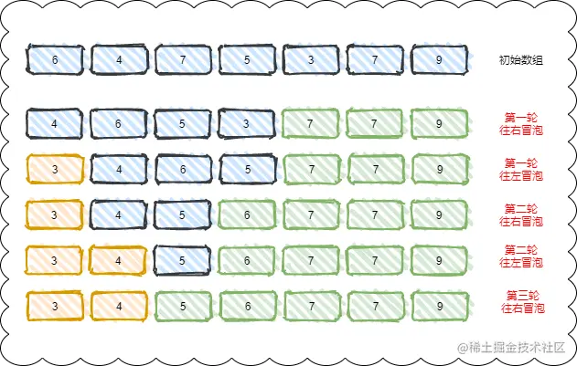可以看到在数据部分有序的情况下,只用了两轮就执行完了排序,最后一轮只是展示结果,实际在第二轮就已经排好序了,是不是又进行了一次优化呢?实际上以上排序算法有一个新的名词叫做鸡尾酒排序,是冒泡排序的一种优化,两者的时间复杂度是一样的,但是鸡尾酒排序更适合那种数组本身存在部分有序的情况下,它的执行效率会比冒泡排序更高。