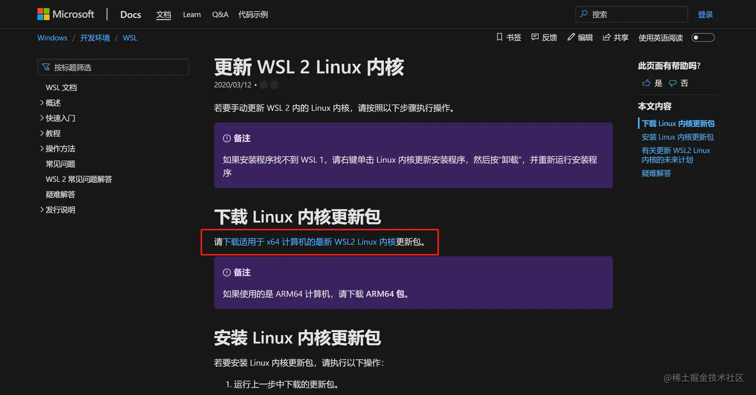 3、提示我们需要更新内核,进入到提示的网站,下载内核更新包: