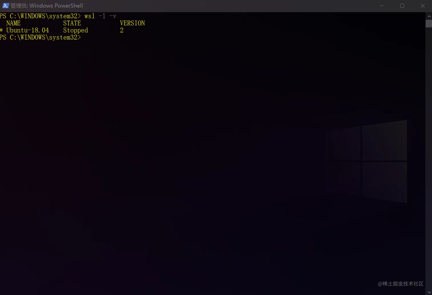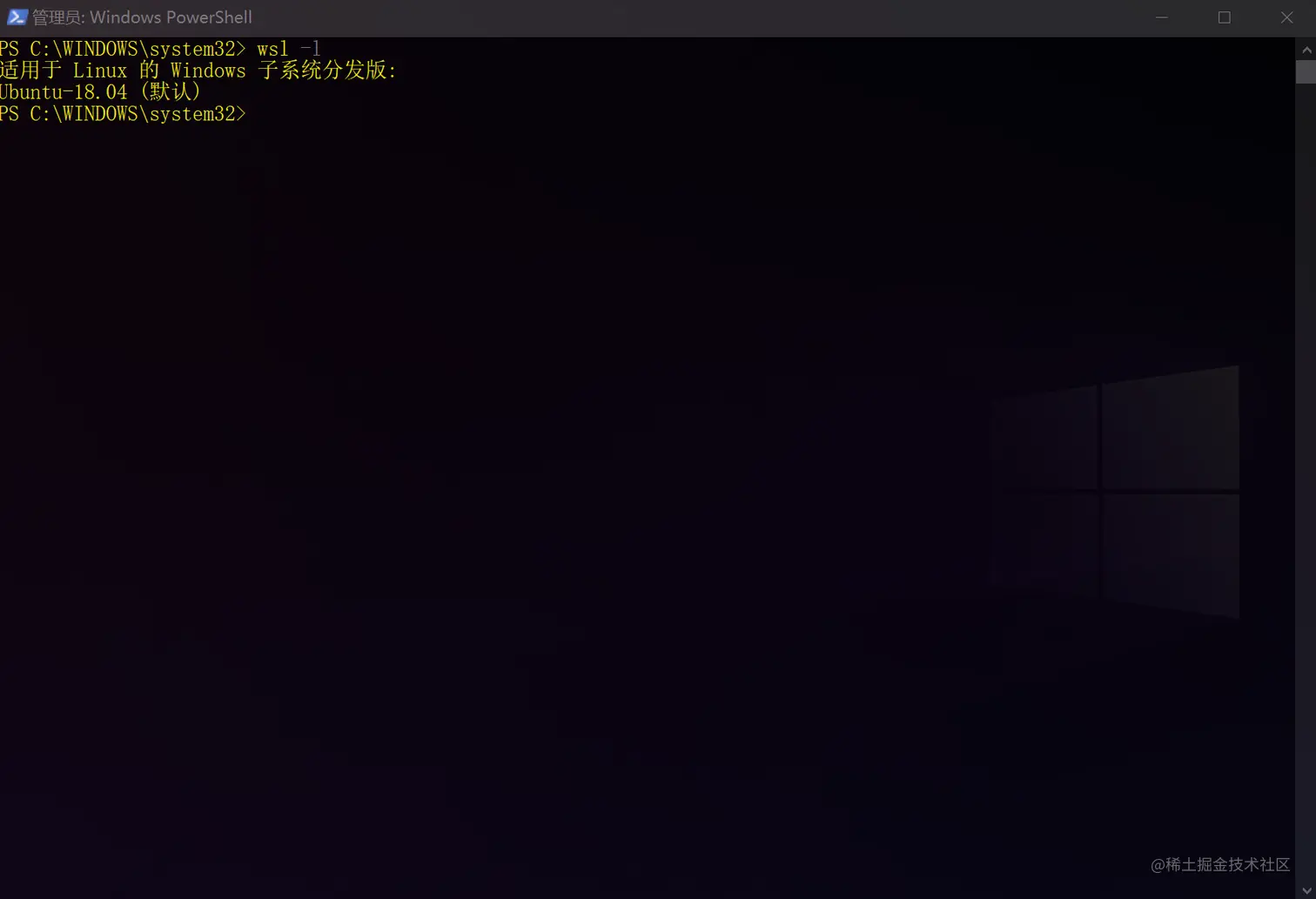1、以管理员身份运行Windows PowerShell,输入wsl -l