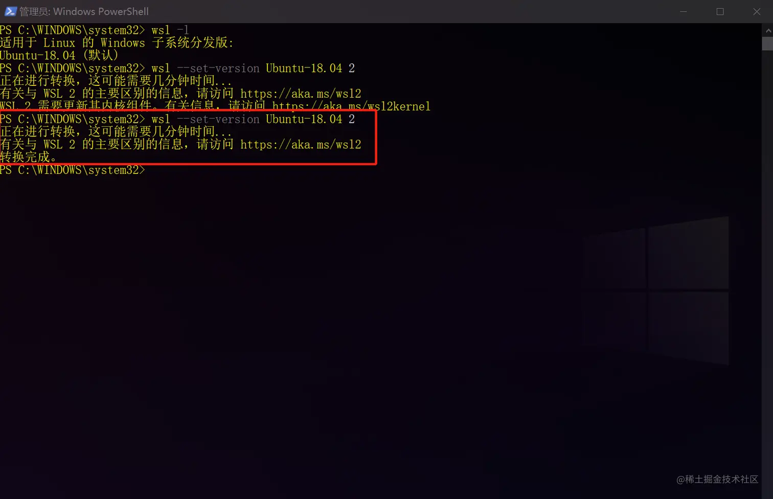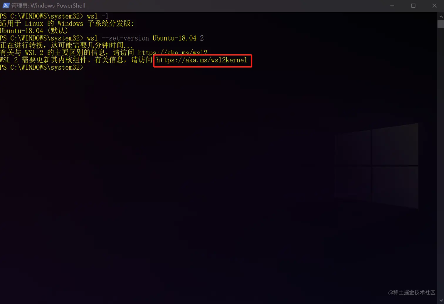 以上就是wsl升级wsl 2的完整步骤了,wsl 2 是跑在虚拟机中的完整 Linux,所以功能方面要比 wsl 强大一些,wsl 2 可以更好地享受完整 Linux 系统带来的方便,不需要因为 wsl 的功能缺失而使用各种迂回方法。如果此篇文章对您有帮助的话,请点个赞😘😘
