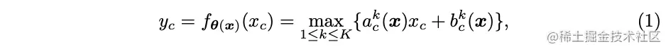 定义原版的ReLU为,为输入向量,对于输入的维特征,激活值计算为。ReLU可统一表示为分段线性函数,论文基于这个分段函数扩展出动态ReLU,基于所有的输入自适应,: