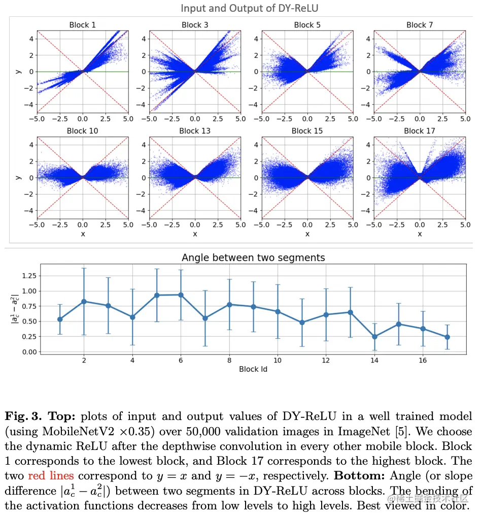 可视化DY-ReLU在不同block的输入输出以及斜率变化,可看出其动态性。