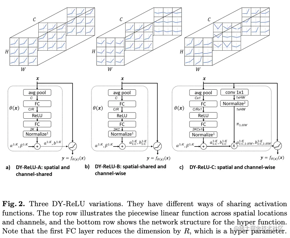 基于上面的想法,论文提出了动态ReLU(DY-ReLU)。如图2所示,DY-ReLU是一个分段函数,参数由超函数根据输入得到。超函数综合输入的各维度上下文来自适应激活函数,能够在带来少量额外计算的情况下,显著地提高网络的表达能力。另外,论文提供了三种形态的DY-ReLU,在空间位置和维度上有不同的共享机制。不同形态的DY-ReLU适用于不同的任务,论文也通过实验验证,DY-ReLU在关键点识别和图像分类上均有不错的提升。