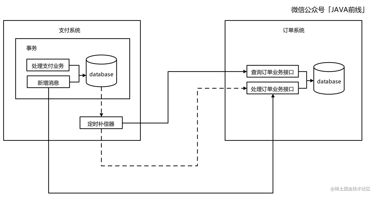 假设你是支付团队成员,订单系统由订单团队维护。订单系统只是通过暴露接口的方式对外进行交互,没有时间配合改造系统为监听消息模式。面对这种场景我们就需要对场景一架构图进行改造,但是核心思想不变。