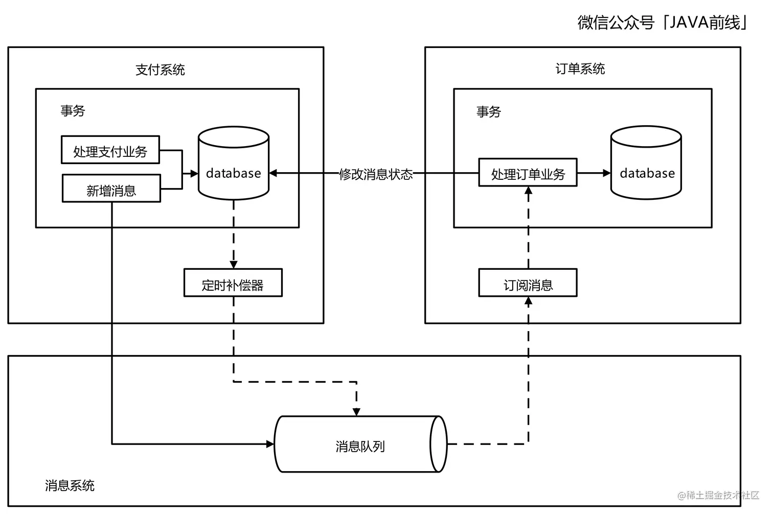 假设你是支付团队成员,订单系统由订单团队维护。订单团队愿意配合你们做系统改造,那么可以使用如下事务性消息架构图: