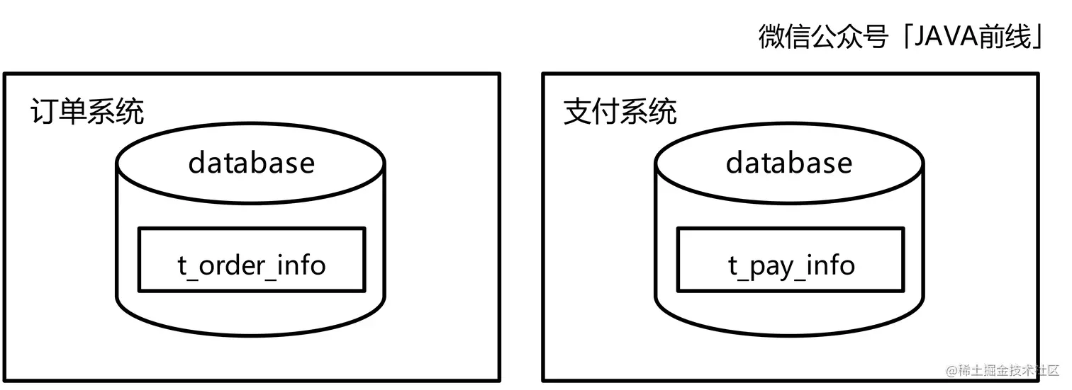 但是在分布式场景中可没有这么简单。在分布式场景中订单是由订单团队维护,支付是由支付团队维护,所以订单系统和支付系统根本是两个系统,分别部署在不同服务器,分别提供服务,更不可能使用一个数据库: