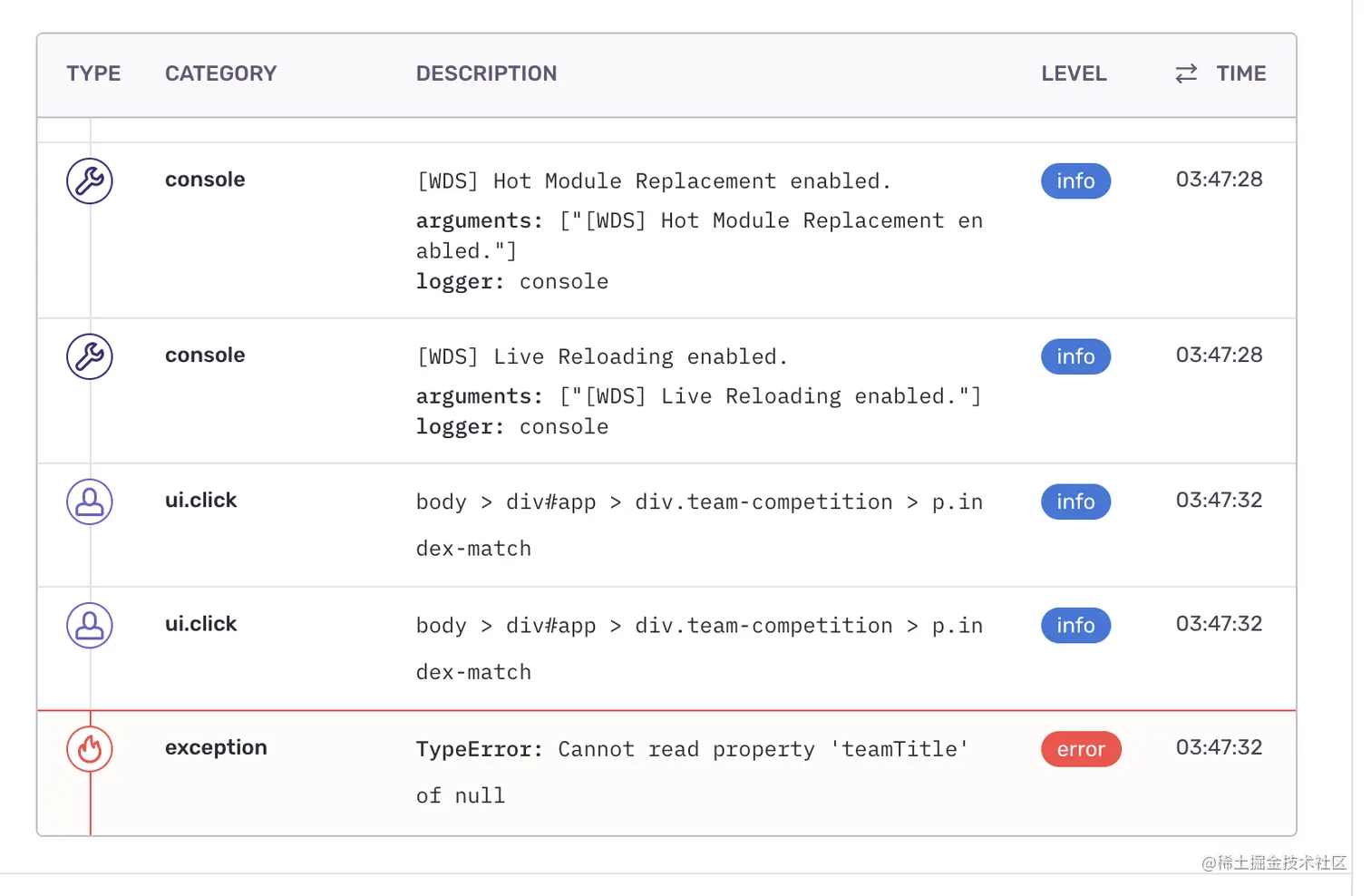 - 点击按钮,在sentry后台发现以下的报错