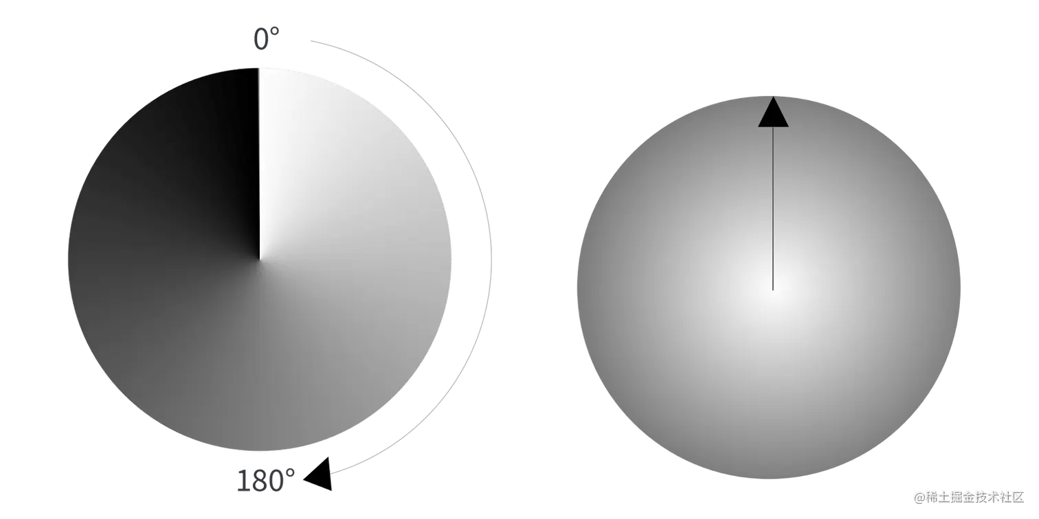 左边是锥形渐变(颜色随着角度变化),右边是辐射状渐变(颜色随着半径长度变化)