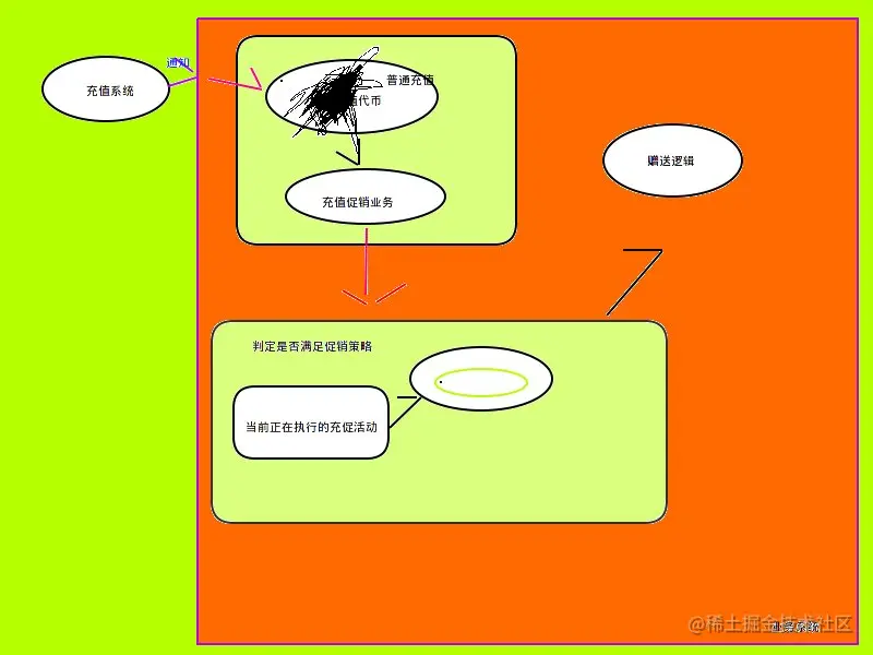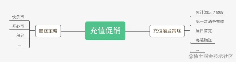 使用责任链模式来衔接普通充值和充值赠送策略业务,使用策略模式来判定赠送,用户充值完后异步判断是否满足促销条件,可以使用mq来解偶相关异步操作,插入充值促销获得记录,插入对应赠送的流水表(比如赠送快乐币)