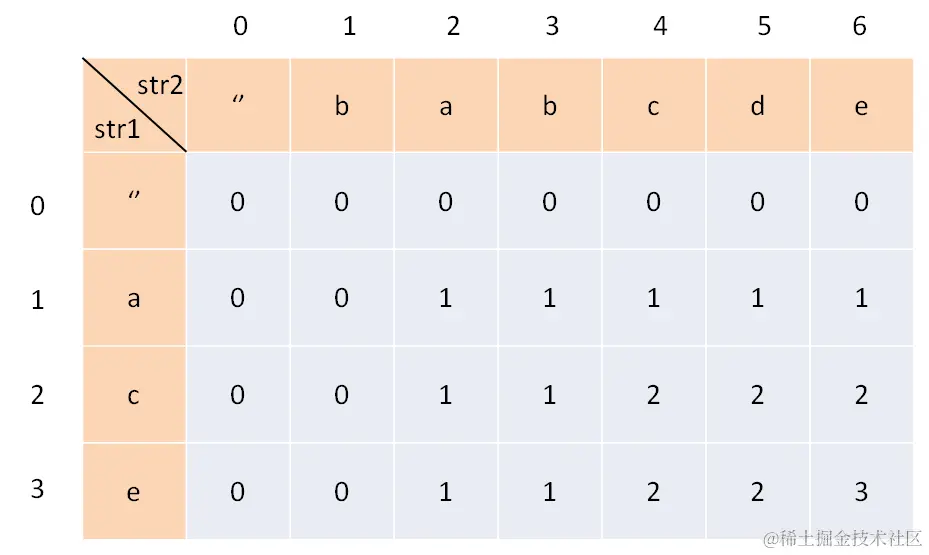 我们专门让索引为 0 的行和列表示空串,dp[0][..] 和 dp[..][0] 都应该初始化为 0,这就是 base case。