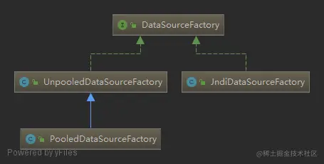 在Mybatis中,用到工厂模式主要在DataSourceFactory。这是一个负责创建DataSource数据源的工厂。DataSourceFactory是一个接口,有不同的子类实现,根据不同的配置,生成不同的DataSourceFactory实现类。类图如下:
