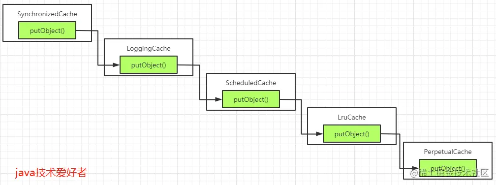 最后在调用Cache的putObject方法时就会一层一层从外到内地调用,实现为对象动态扩展功能的装饰器模式。